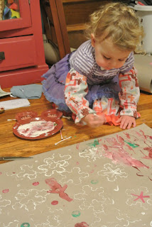 You still love to make crafts and art, and just as always, have your own very specific ways that you like to do things. For instance this morning after music class I pulled out your new watercolors for you and Louise, but rather than paint the paper you were much more intrigued with mixing colors in the water glass. "Look mama, what a beautiful purple!" You then proceeded to dump the water onto the watercolor paints, smear your hands all over them and finger paint with them. Ah my tactile girl. I think we'll be making some more playdough this afternoon.